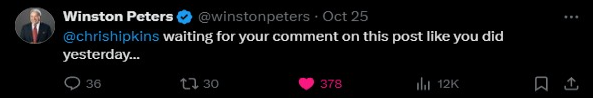 The next day, on Friday afternoon the deputy Prime Minister Winston Peters posted again to his personal 𝕏 account continuing to call out Labour leader Chris Hipkins.